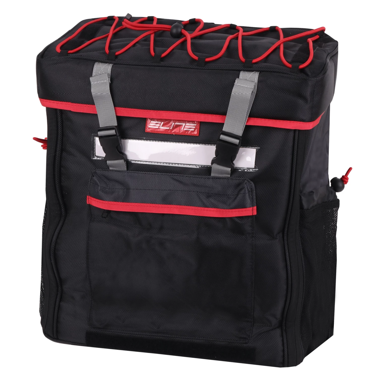 Ontworpen voor gevorderde triatleten wanneer er niet genoeg ruimte beschikbaar is in de kleedkamer. De bovenkap moet worden losgemaakt en aan de bodem worden bevestigd; neem vervolgens de twee schoenenzakken (fietsen en hardlopen) eruit. Haal de T1-tas uit elkaar, haak de fietsschoenen aan de fiets, stop de lege T1-schoenentas in de tas en bevestig alleen de T2-tas met de loopschoenen aan de voorkant van de triatlonbox. Vervolgens moeten de 4 zijritsen van de tas tot de helft van hun lengte worden geopend, de zijdelen worden omgevouwen en de uiteinden in het aan de bodem bevestigde deksel worden gestopt. Op die manier wordt de benodigde ruimte beperkt en toch is al het materiaal voor de wedstrijd netjes gerangschikt en klaar voor razendsnel gebruik.