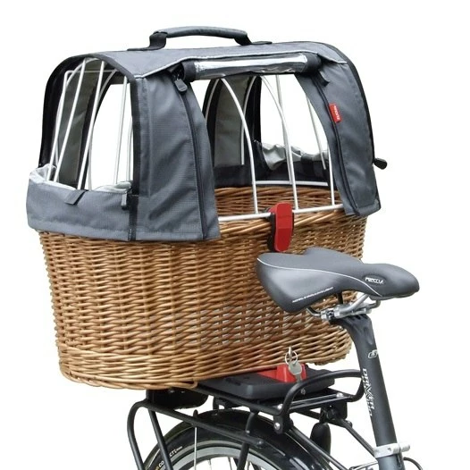 This pet basket for bicycles encloses many new ideas. No annoying leather straps to close. Two special hinges and the KLICKfix closure allow a very comfortable handling. The grid top is completely detachable. The variable hood leaves plenty of air and light access and gives a good protection against wind, sun and rain. All the sides can be closed completely. With washable cushion, reflector and handle. Maximum load 10 kg.
