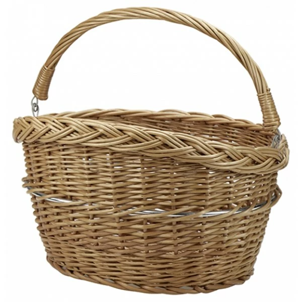 De mand is geweven van natuurlijk wilgenhout en heeft een opvouwbaar handvat en een verchroomde adaptersteun. Het is nauwelijks zwaarder dan de draadmanden. Dit maakt winkelen leuk – gewoon op de knop drukken en meenemen.