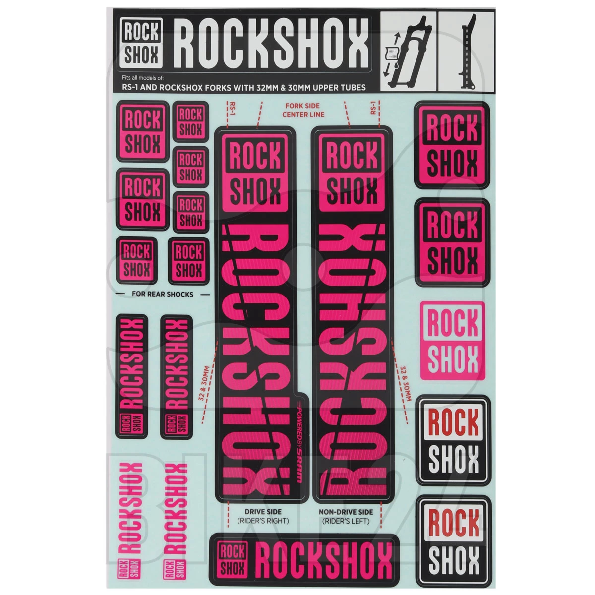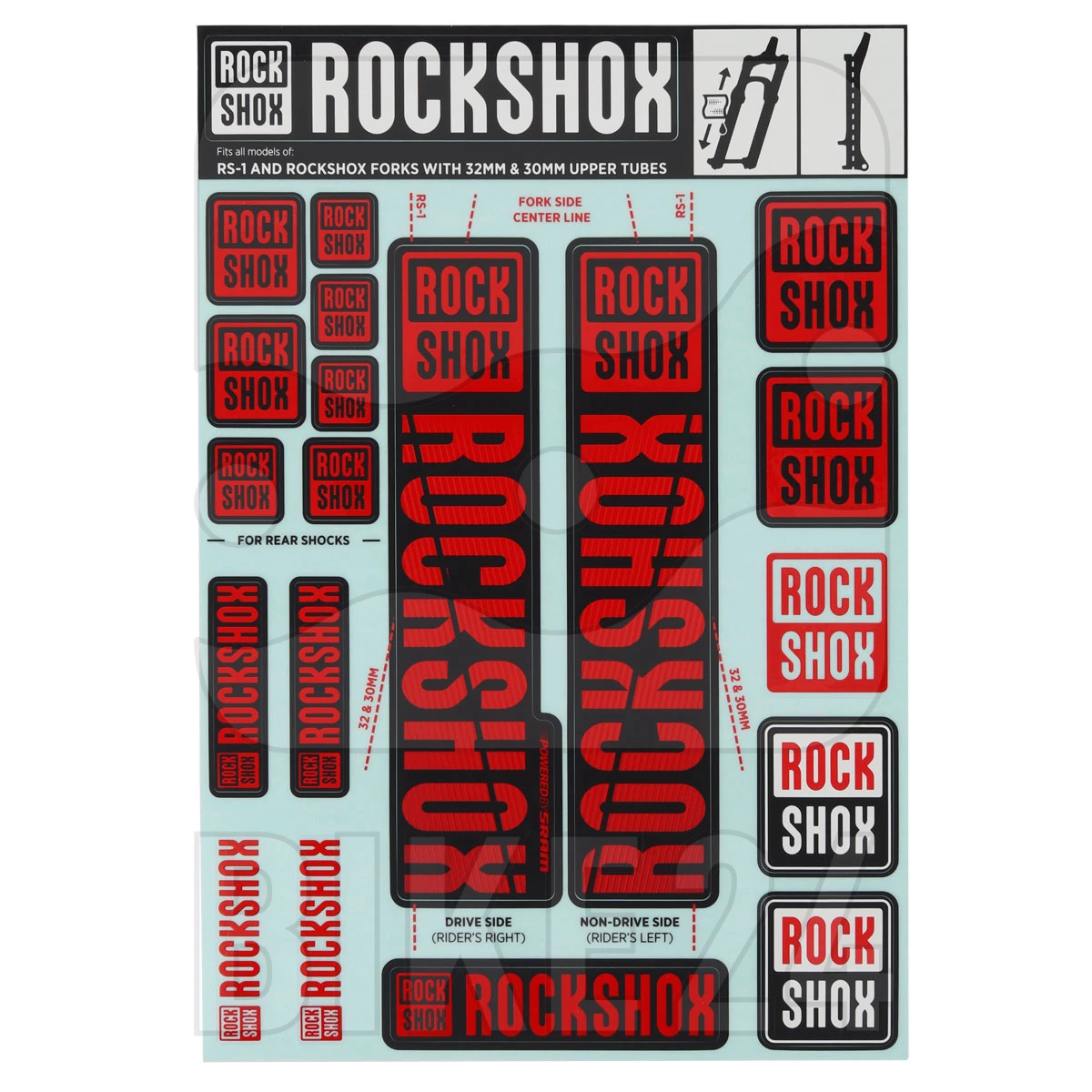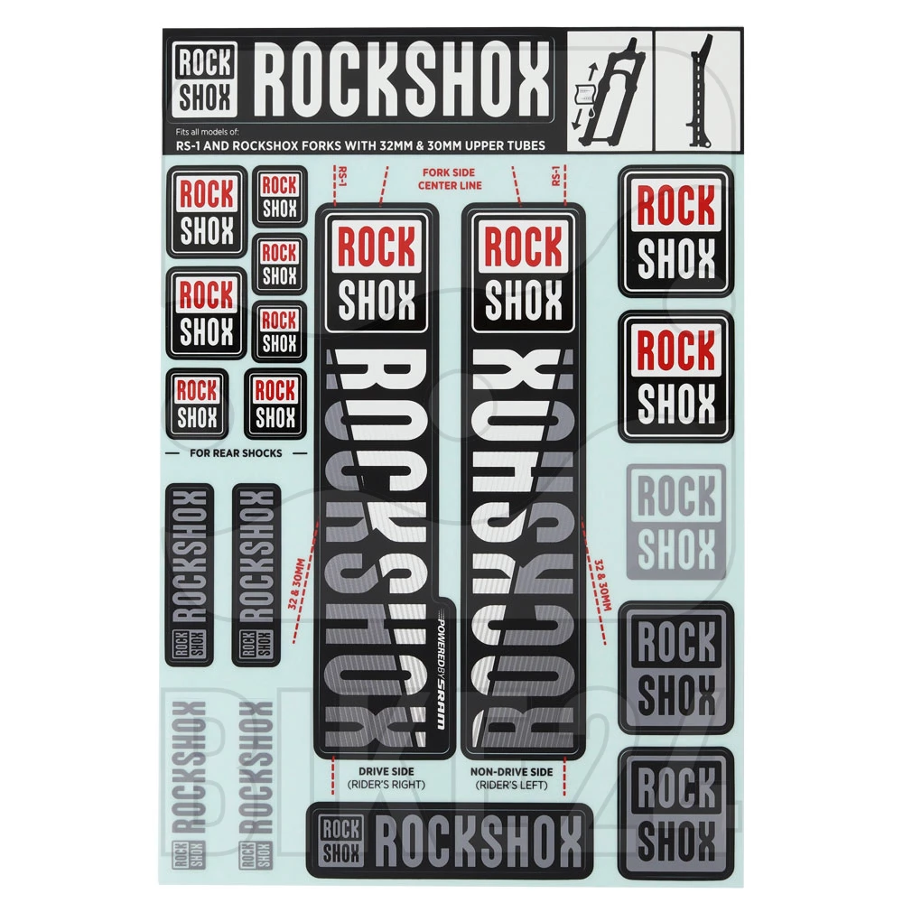 Stickerset voor RockShox verende vorken met 30/32mm standpijpen. Verschillende versies beschikbaar.